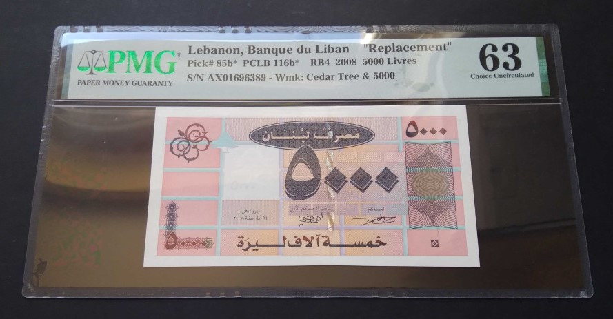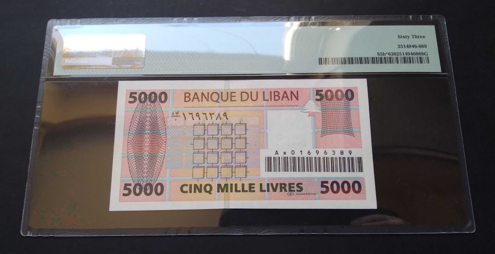 Lebanon 5000 Livres 2008 Unc PMG certified banknote